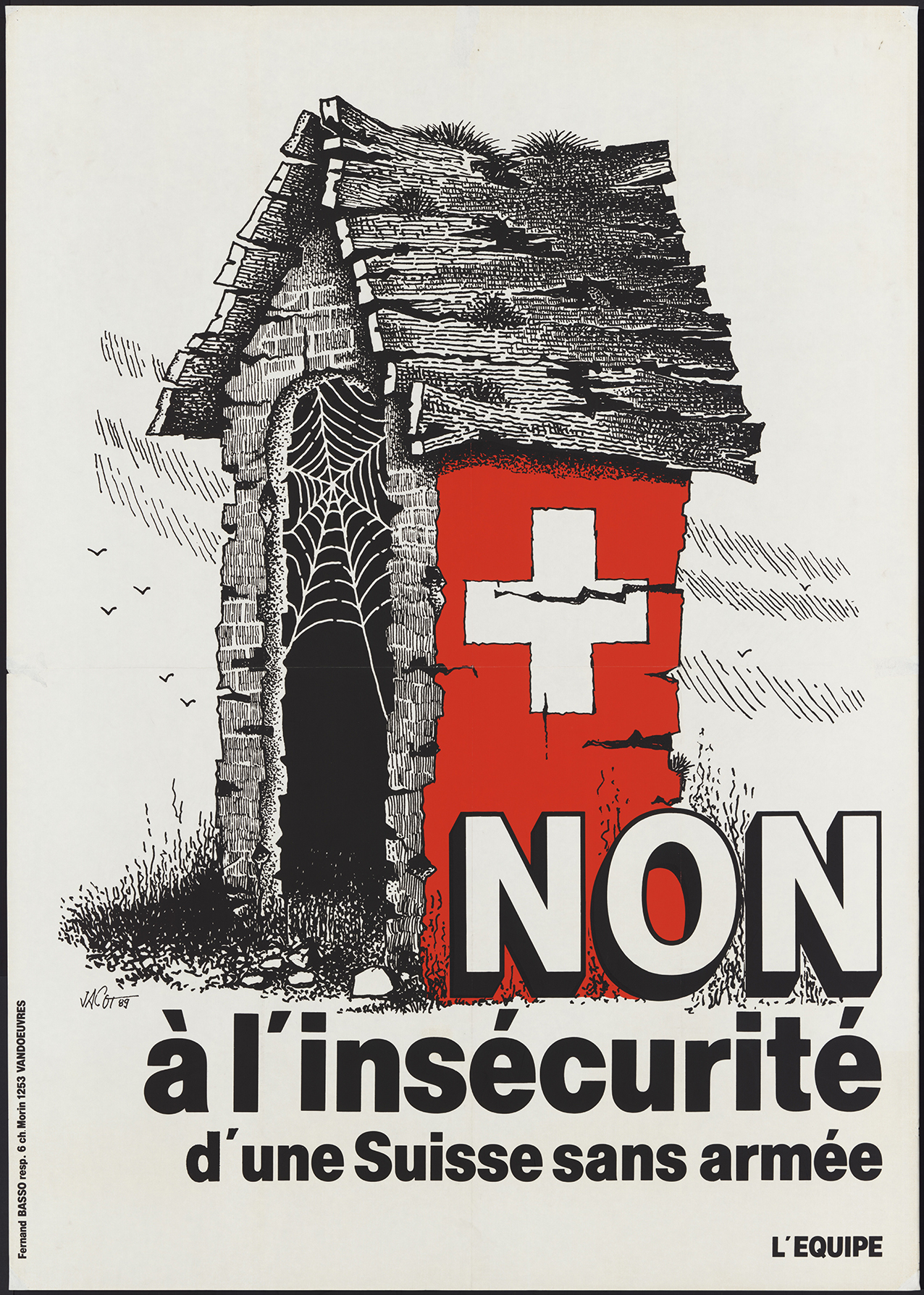 Affiche contre l'nitiative Pour une Suisse sans armée et une politique globale de paix représentant un cabanon en ruines, avec un drapeau suisse peint sur le mur côté droit.