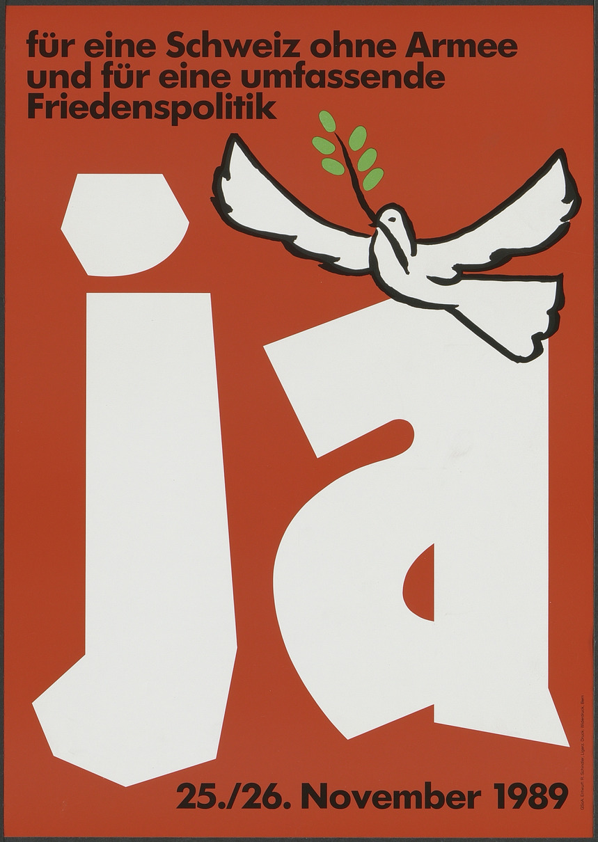 Affiche pour l'initiative Pour une Suisse sans armée et une politique globale de paix représentant une colombe.