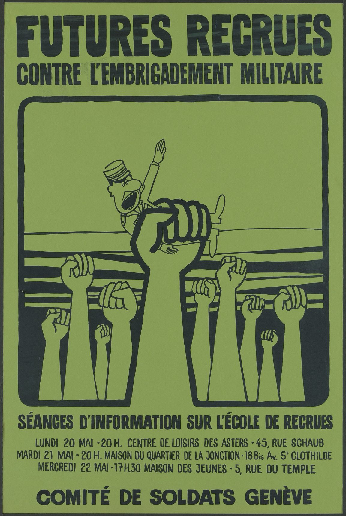 Affiche pour des séances d'information sur l'école de recrues et les luttes des soldats à Genève.