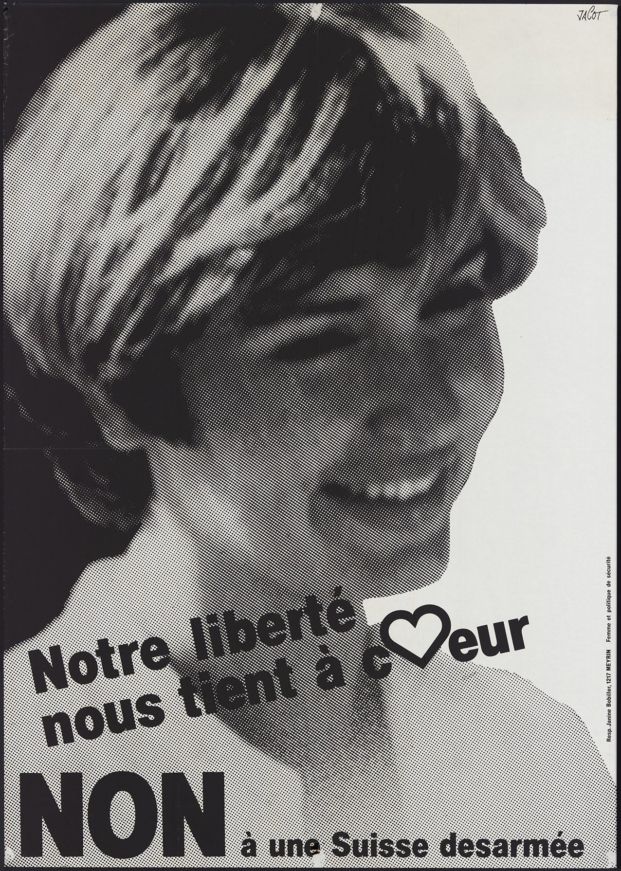 Affiche s'opposant à l'initiative Pour une Suisse sans armée et une politique globale de paix. L'affiche représente un visage de femme.