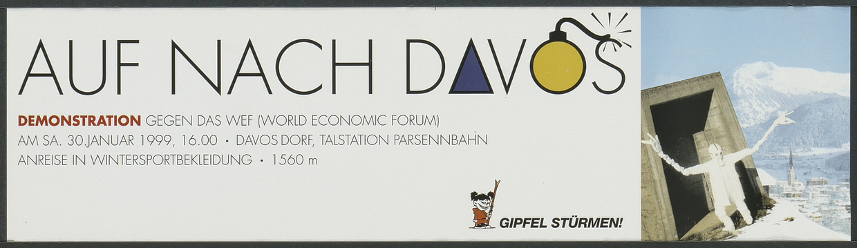 Affiche pour une manifestation contre le WEF (World Economic Forum) à Davos. Photographie représentant un personnage squelettique aux bras immenses, dans la neige devant ce qui pourrait être l'entrée d'un bunker.