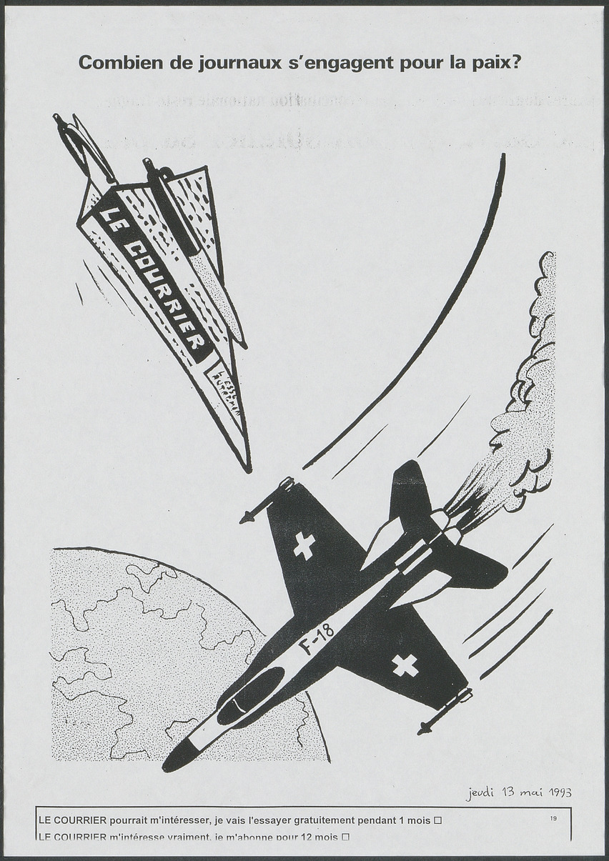 Publicité pour un abonnement au journal genevois Le Courrier. Dessin d'un avion en papier fabriqué avec le journal, et un F/A-18.