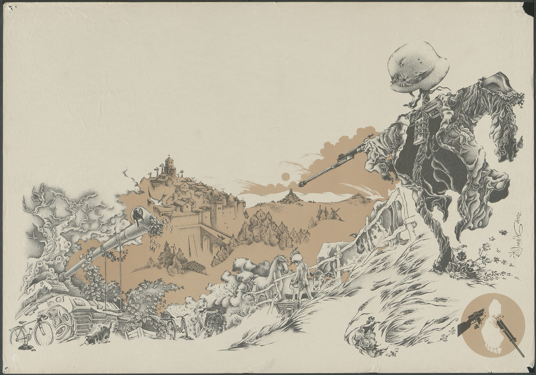 Affiche représentant une scène champêtre avec des enfants s'affairant auprès d'animaux (des vaches et un cheval). Au premier plan à droite se trouve un épouvantail militaire fabriqué grâce à une arme de service montée sur un pied de vigne. À gauche de l'image se trouve un char militaire gagné par la végétation, un nid d'oiseau dans le canon.
