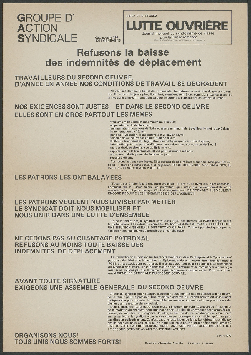 Affiche appelant à refuser la baisse des indemnités de déplacement pour les travailleur du second œuvre.