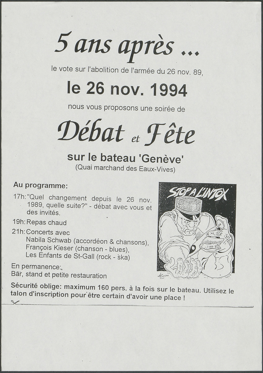 Affiche pour un débat et une fête au bateau Genève, 5 ans après la votation sur l'initiative visant à abolir l'armée suisse.
