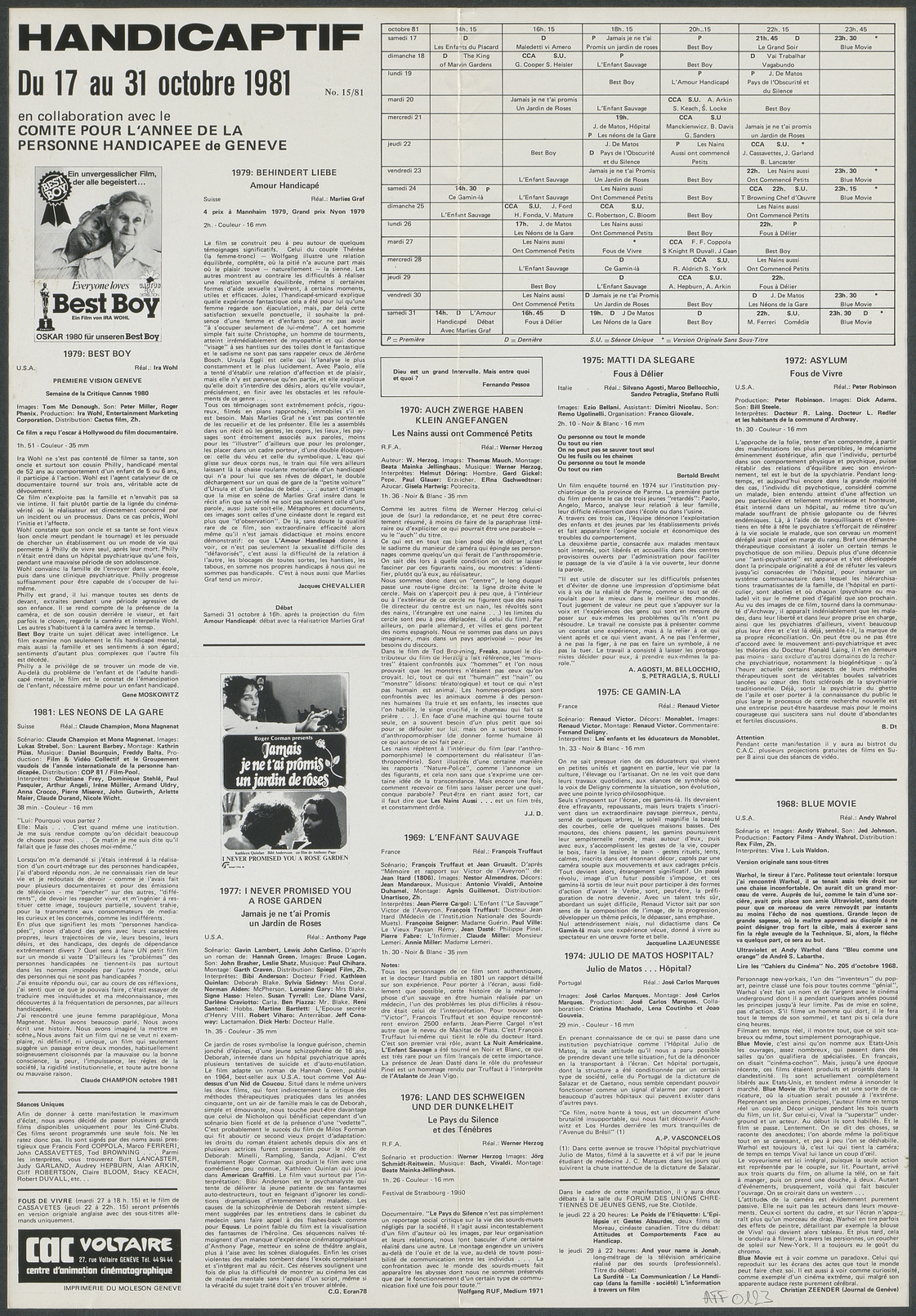 Affiche et programme pour un cycle de projections au cinéma CAC Voltaire à Genève, autour de la question du handicap. Image d'une aile d'oiseau à travers des barreaux. Liste et description des films au verso.