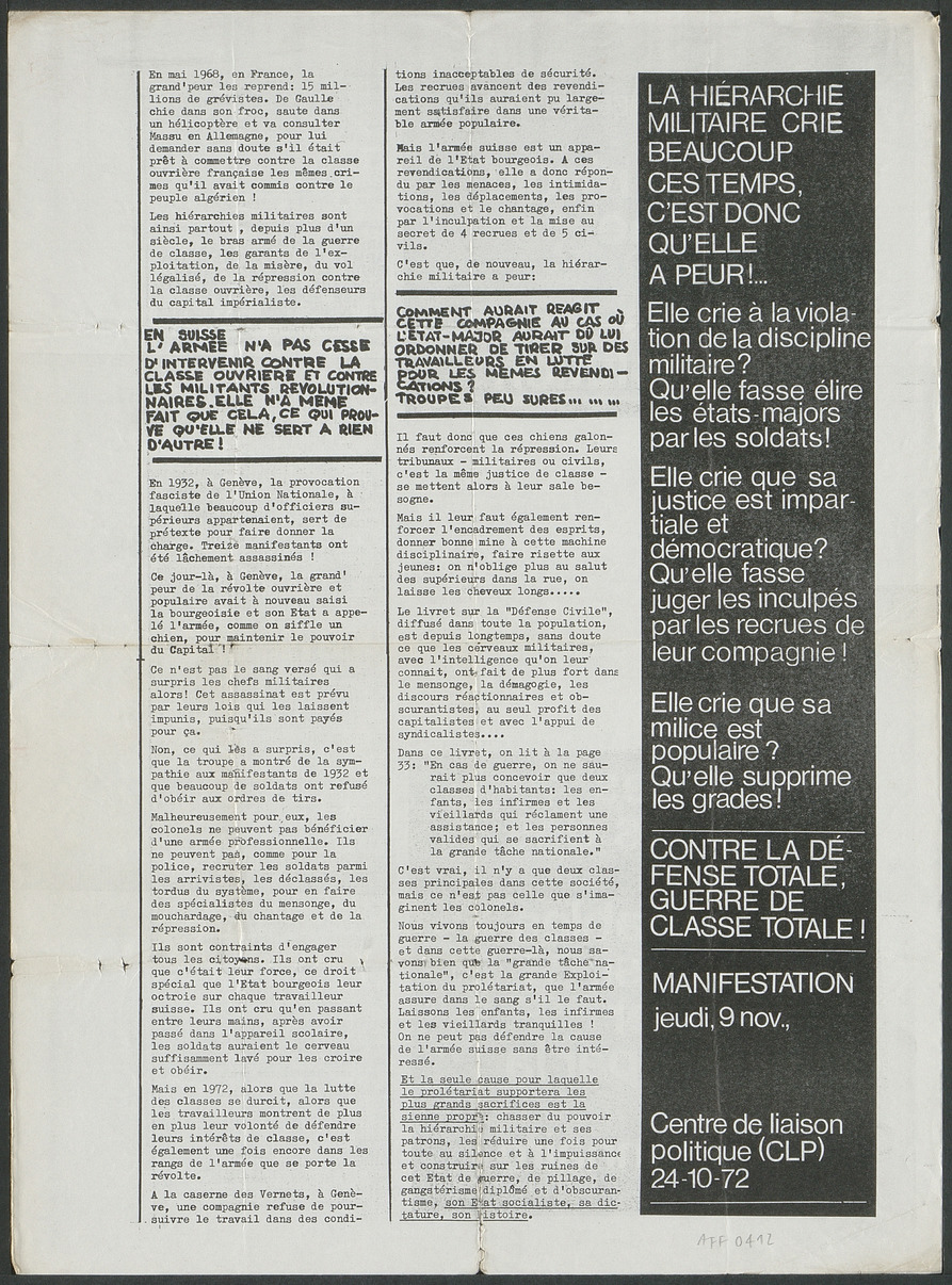 Affiche-tract appelant à une manifestation le 9 novembre 1972, 40 ans après la fusillade de 1932 à Genève. Le tract critique notamment l'armée suisse, « qui n'a pas cesse d'intervenir contre la classe ouvrière et contre les militants révolutionnaires ».