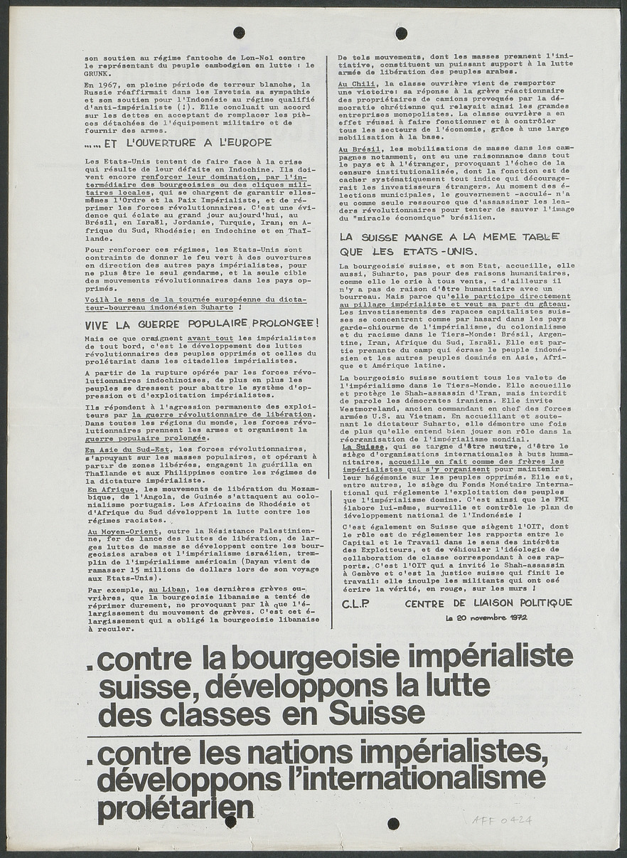 « Contre la bourgeoisie impérialiste suisse, développons la lutte des classes en Suisse »
