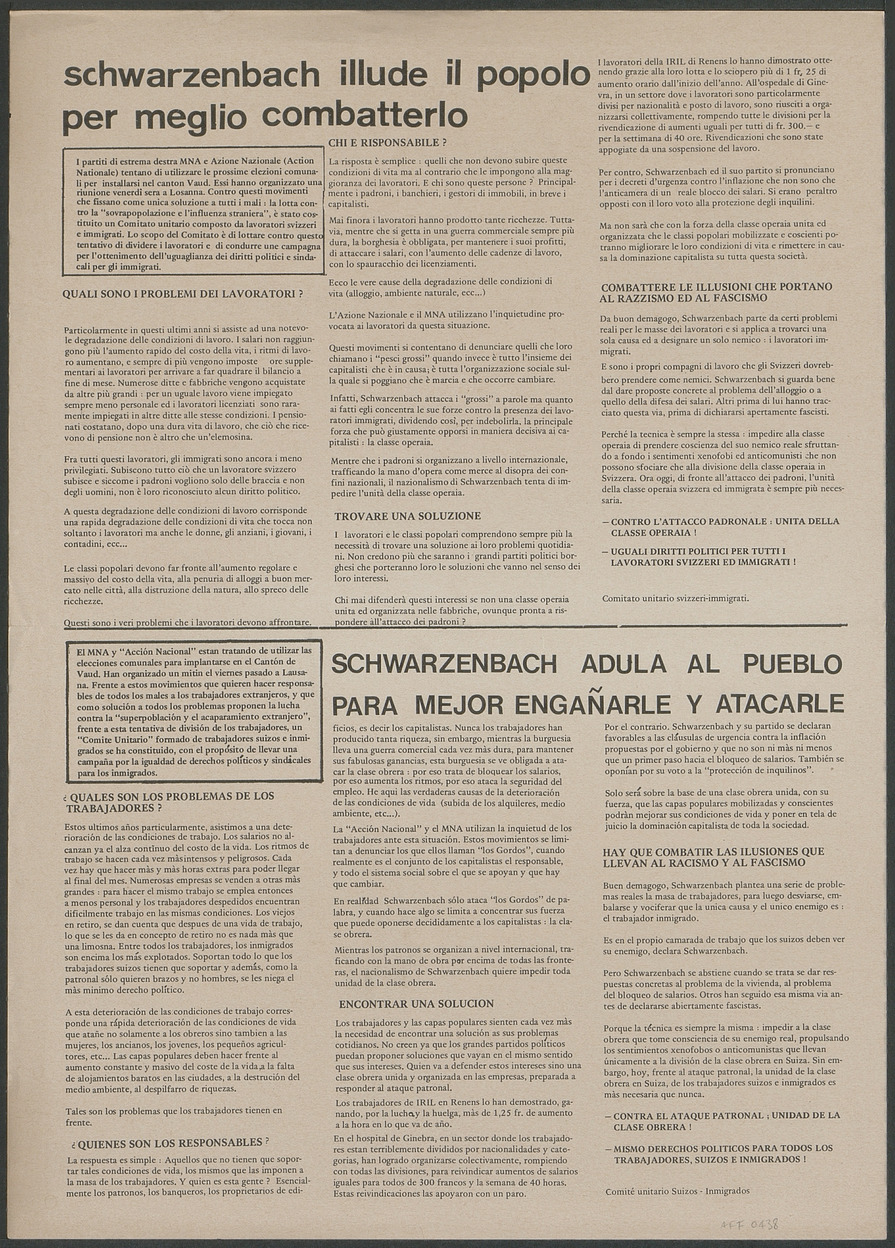 Affiche sur l'implantation d'Action Nationale dans le canton de Vaud et sur Schwarzenbach. Verso en italien et espagnol.