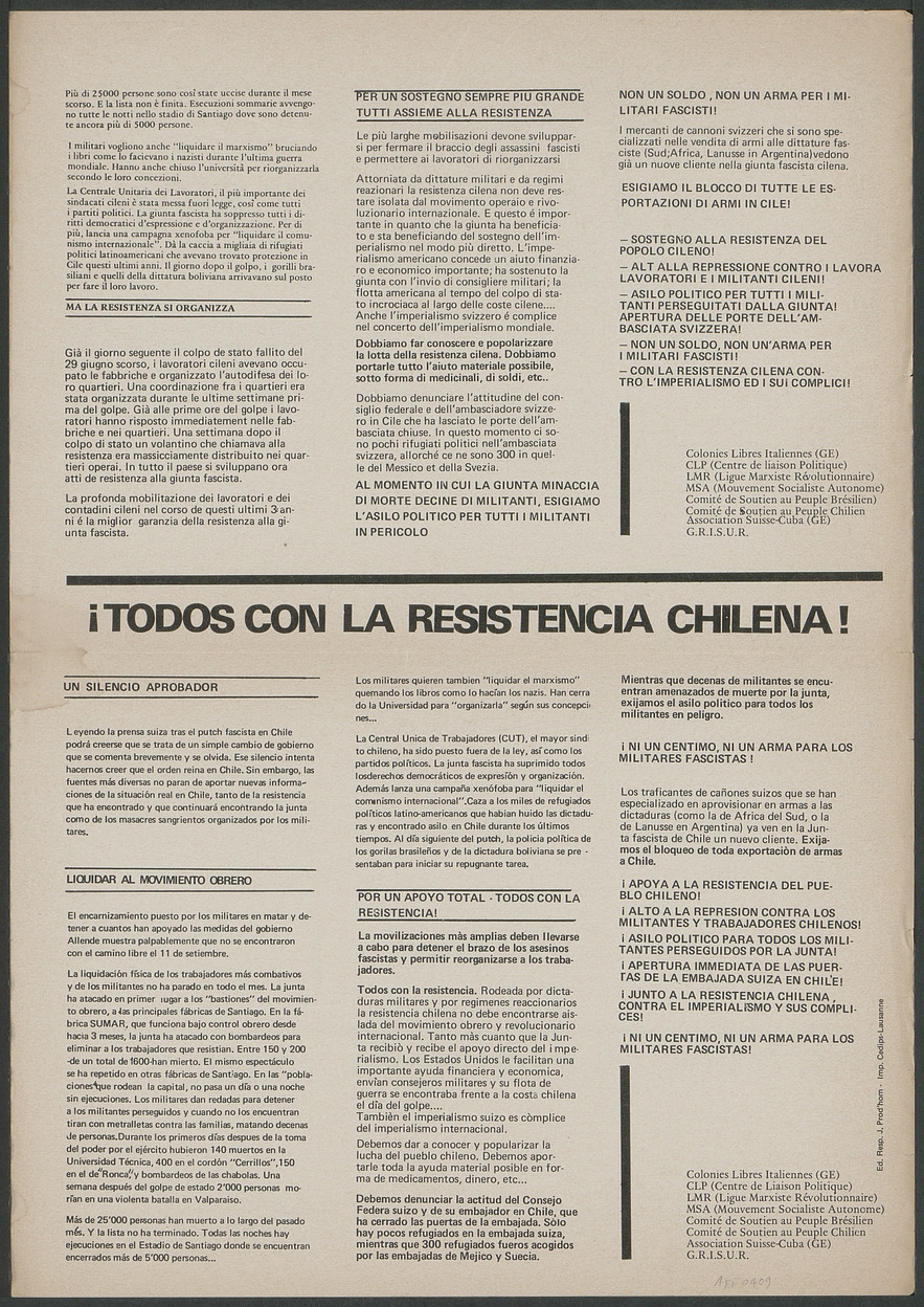 Affiche-tract sur le coup d'état de 1973 au Chili et sur la résistance chilienne.