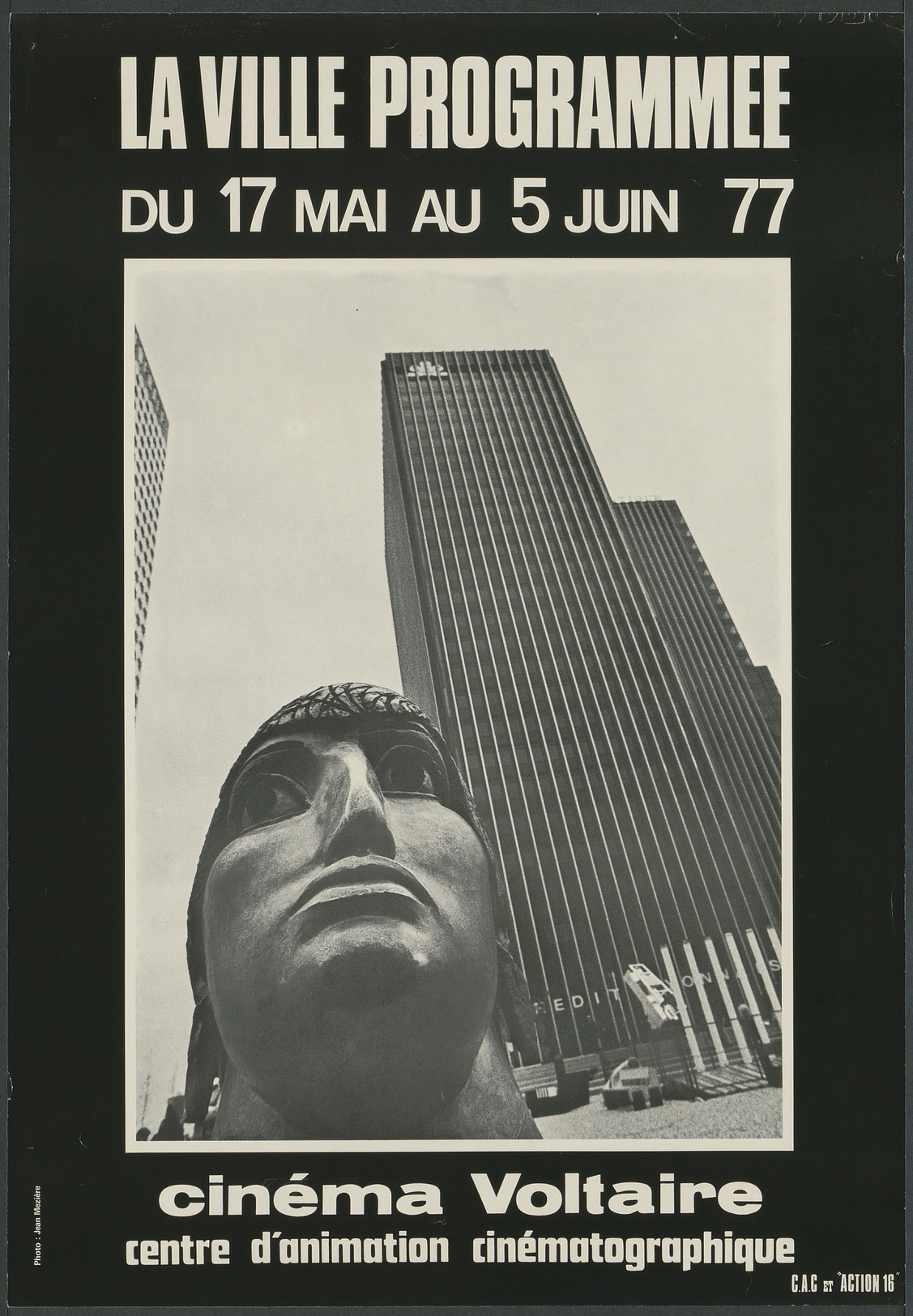 Affiche et programme pour le cycle de projection « La ville programmée » au cinéma Voltaire. Réflections sur la représentation de la ville à l'écran. Liste des films.