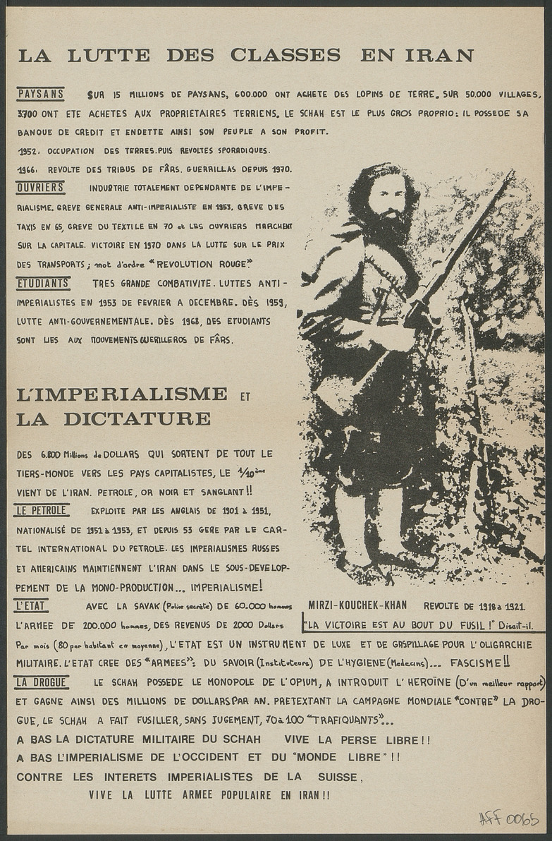 Affiche sur une action de soutien et de solidarité « avec la lutte révolutionnaire des peuples d'Iran ». Dénonciation de la politique suisse en Iran. Au verso, informations sur la lutte des classes et sur l'impérialisme en Iran.