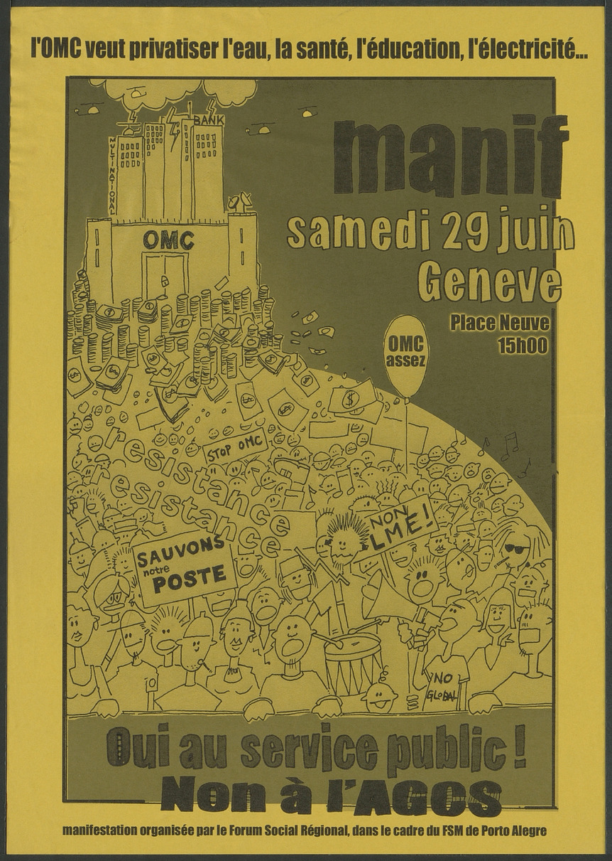 Affiche pour une manifestation contre l'OMC à Genève. « Oui au service public, non à l'AGCS [Accord général sur le commerce des services] ».