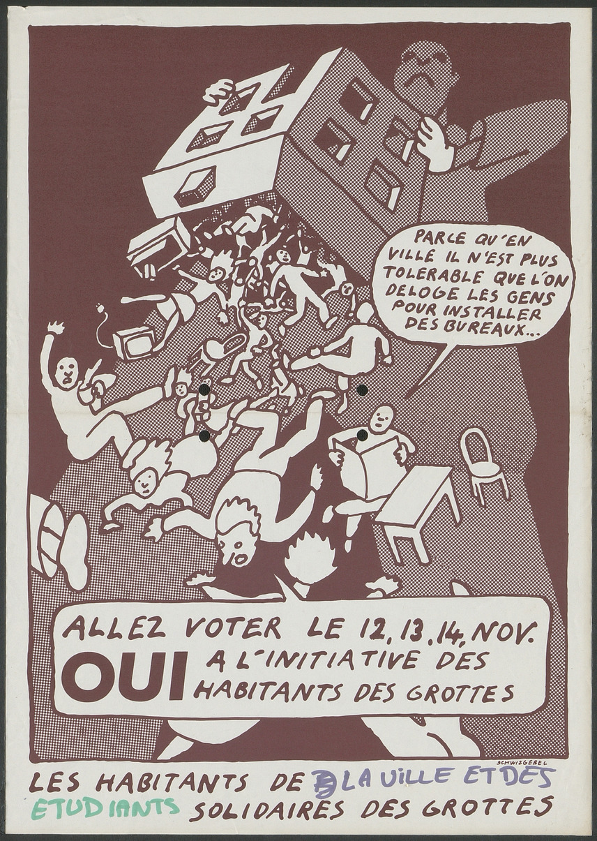 Sérigraphie de Georges Schwizgebel pour appeler à voter "oui" à l'"initiative pour la réhabilitation / remise en état du quartier des Grottes". L'auteur laisse volontairement un champ libre pour appeler en son nom à voter "oui", c'est fait ici par "les habitants de la ville et des étudiants solidaires des Grottes". Sur l'affiche on voit un personnage géant vider une maison de ses habitants par le toit en la retournant. L'un des petits personnage évacué dit "Parce qu'en ville il n'est plus tolérable que l'on déloge les gens pour installer des bureaux..." et un autre complète "Allez voter OUI le 12, 13, 14 nov. à l'initiative des habitants des Grottes".