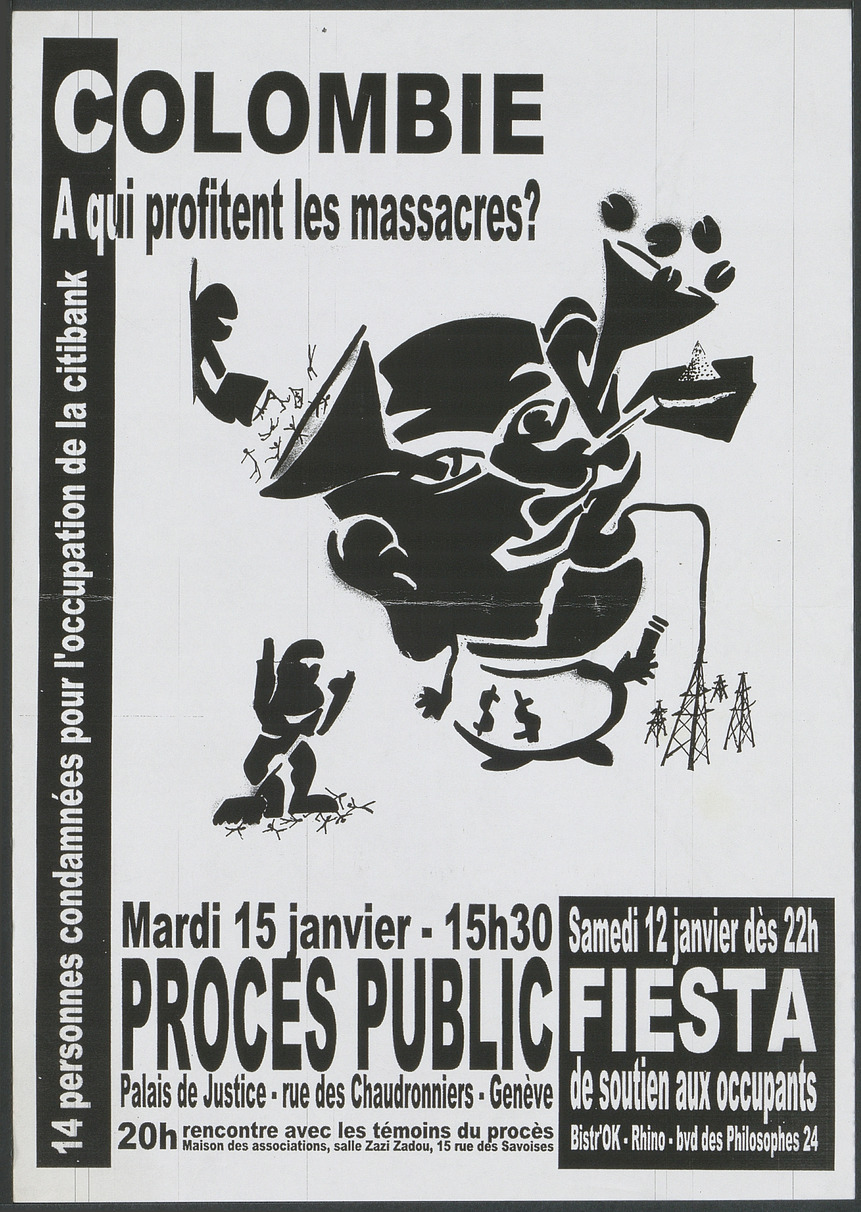 Affiche pour une soirée et appelant à se rendre au Palais de justice à Genève pour soutenir les « 14 personnes condamnées pour l'occupation de la citibank ». Celles-ci avaient été arrêtées dans le cadre d'une occupation visant à dénoncer les massacres des Afrocolombiens et les implications de la banque américaine dans ceux-ci. Un dispositif policier important fut déployé au Tribunal de police le jour du procès.
