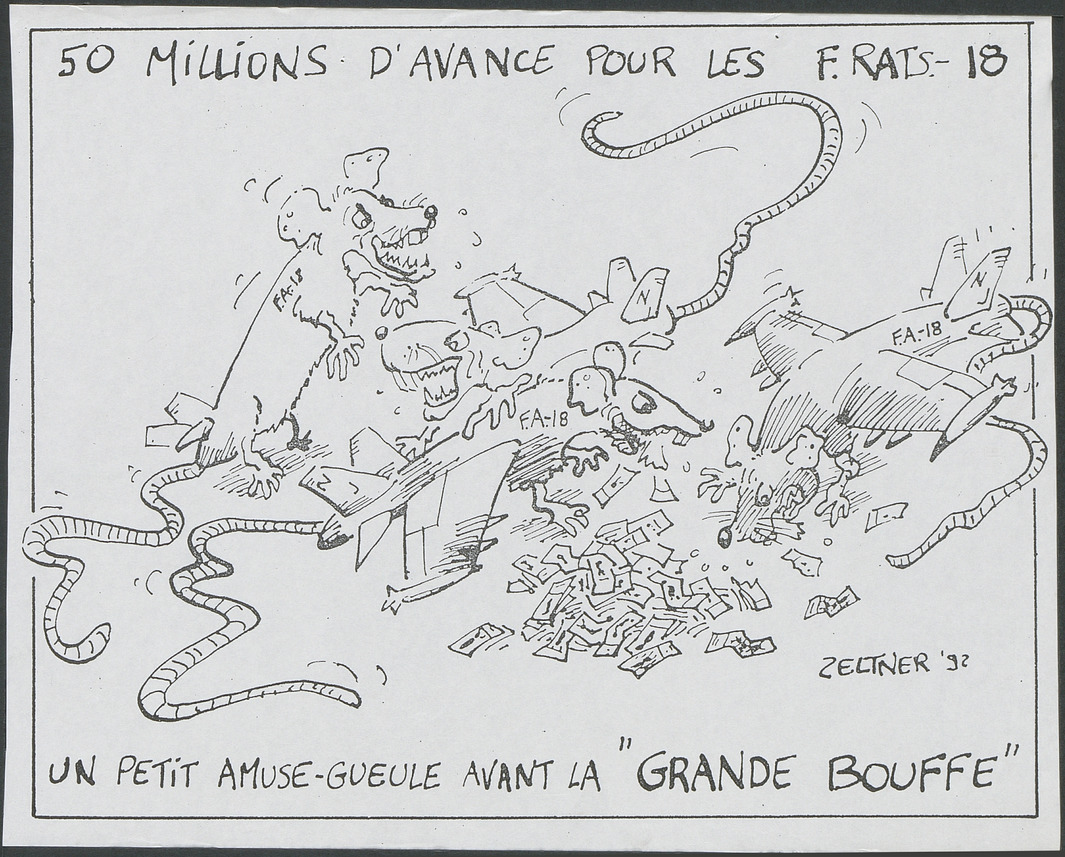 Affiche représentant des rats en forme de F/A-18 dévorants des billets de banque.