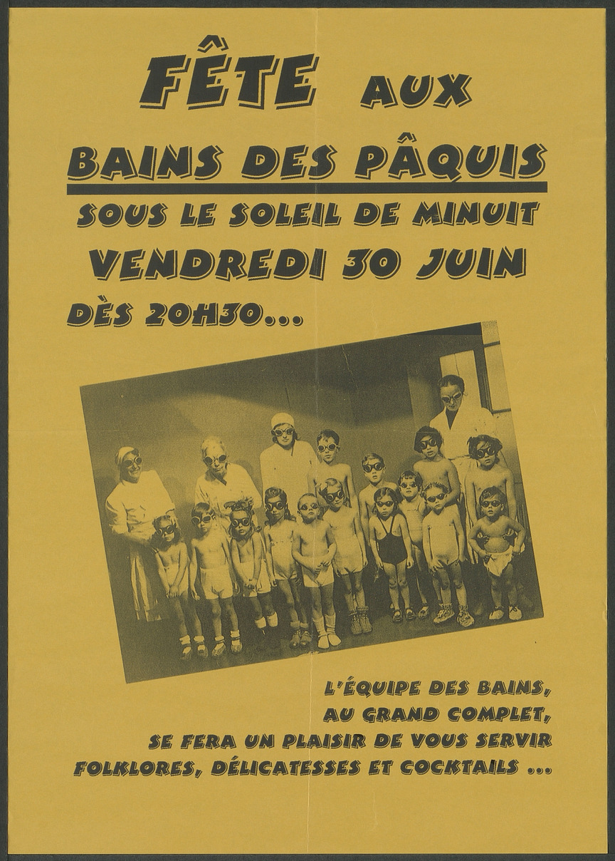 Affiche pour une fête aux Bains des Pâquis. Photographie d'un groupe d'enfants posant en maillot de bain, des personnes en blouse blanche derrière eux, tout le monde porte des sortes de lunettes de piscine.