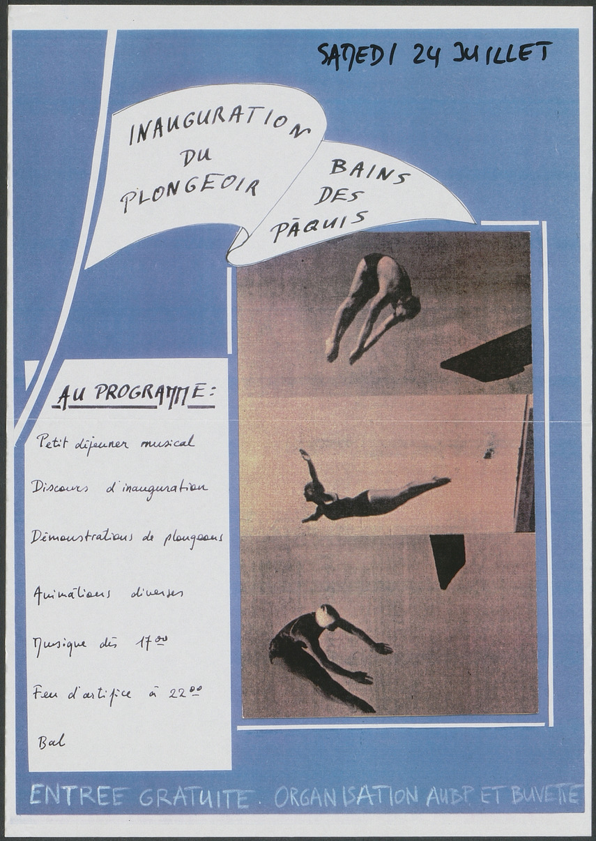 Affiche pour l'inauguration du plongeoir des Bains des Pâquis. Démonstrations de plongeons et autres animations. Photographies de plongeons.