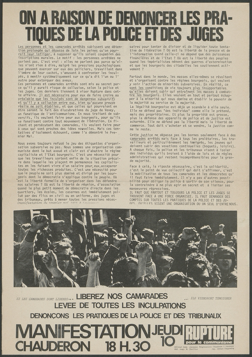 Appel à une manifestation à Lausanne pour dénoncer la répression infligée à des personnes proches du journal Rupture pour le communisme, accusés « d'inscriptions murales », qui subirent « une détention prolongée qui dépasse de loin les peines qu'on pourrait leur infliger ». Affirmation de la nécessité d'être solidaire face à cette répression.