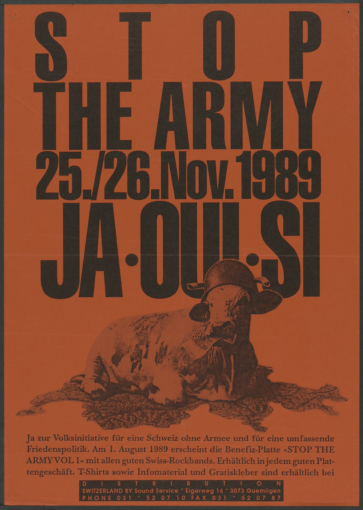 Affiche pour l'initiative Pour une Suisse sans armée et une politique globale de paix et pour le vinyl de soutien « Stop The Army Vol. 1, [avec tous les bons groupes suisses de rock] ». Distribué par Sound Service. Image représentant une vache portant un casque militaire, couchée sur un pictogramme de la Suisse, avec un billet de 1 000 CHF dans la bouche.
