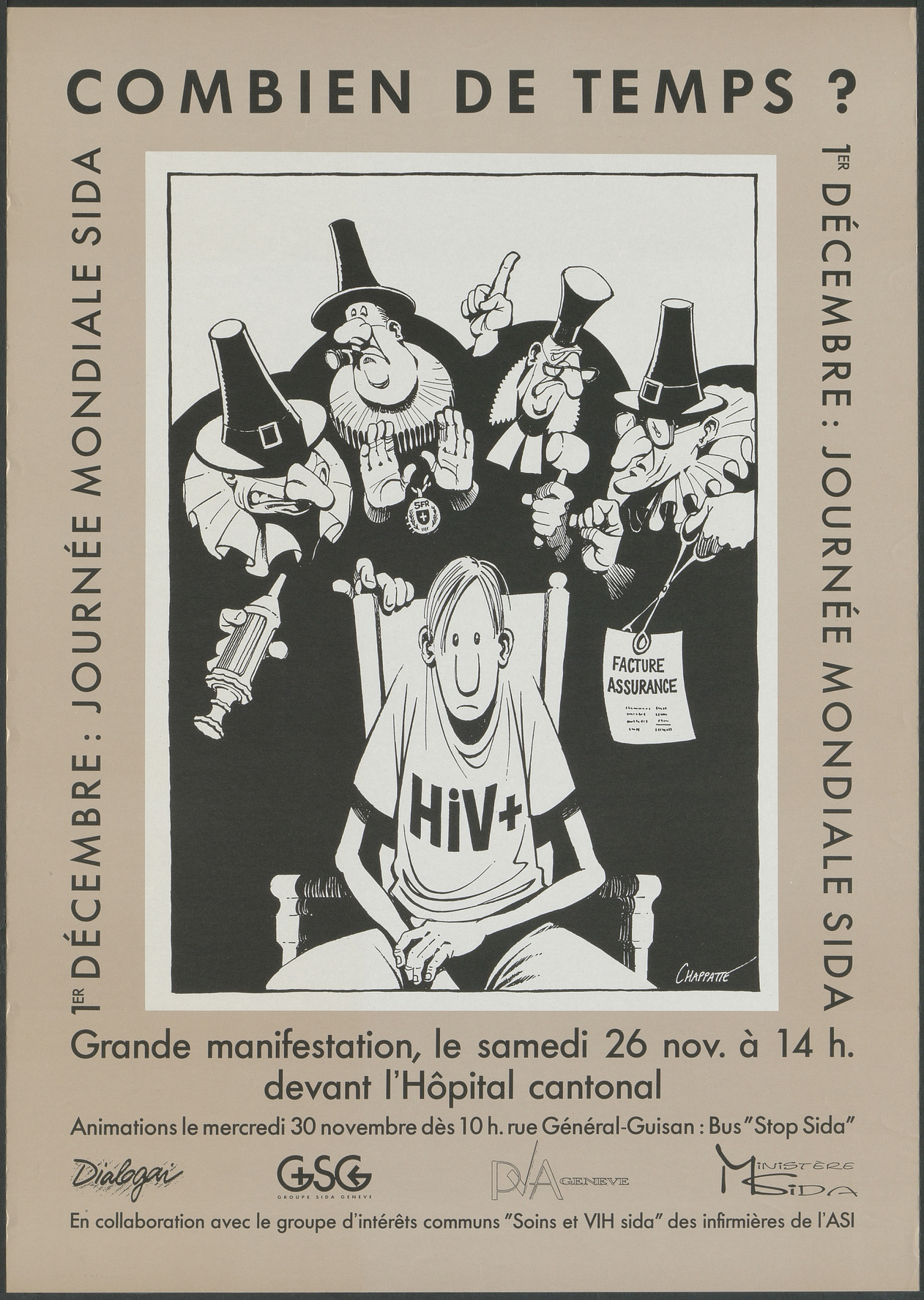 Affiche pour une manifestation à l'occasion de la journée mondiale contre le sida du 1er décembre 1988. Dessin de Chapatte représentant un homme portant un t-shirt HIV+ entouré de notables en habit (médecin, banquier, juge et assureur).