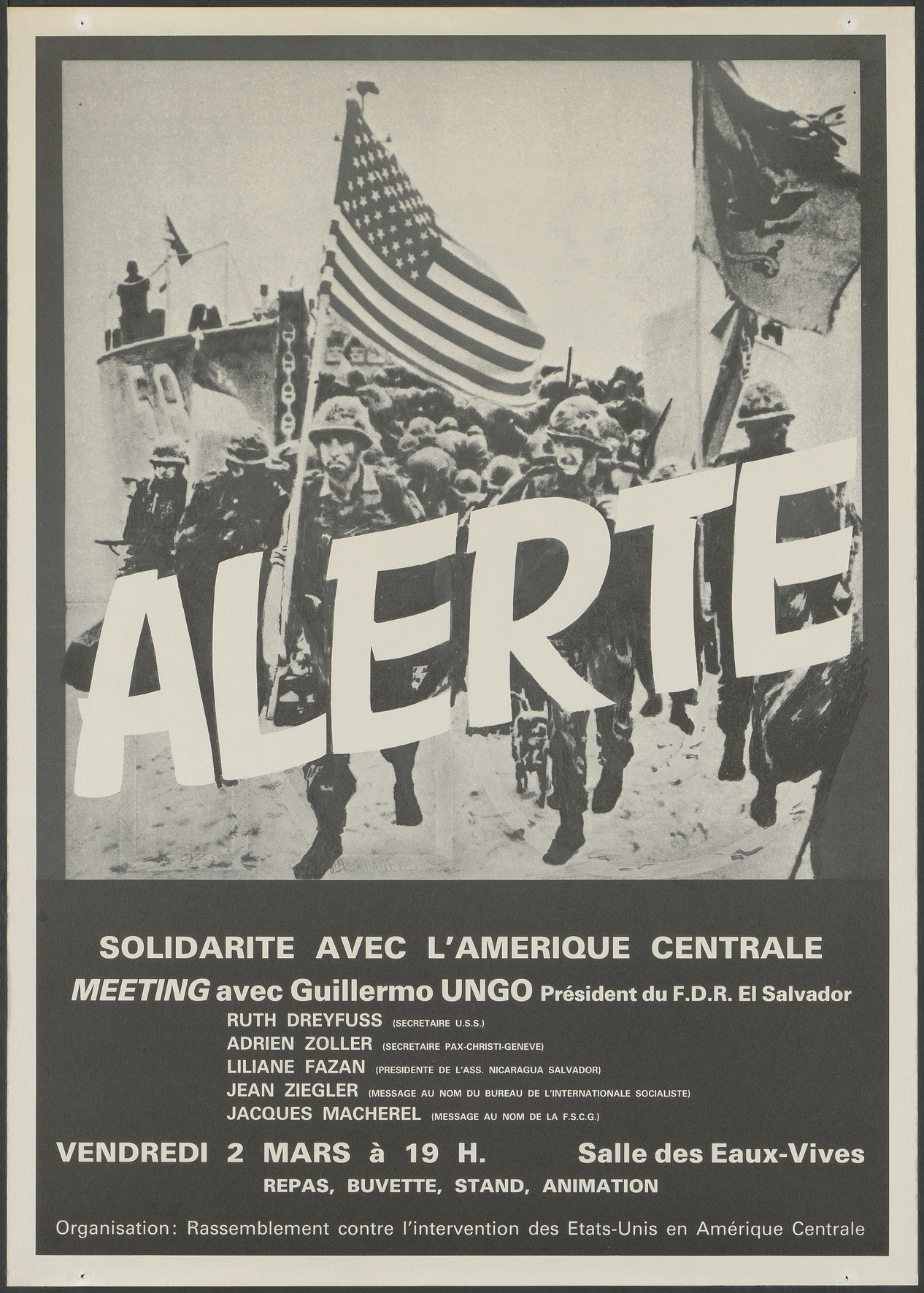 Affiche pour un meeting avec Guillermo Ungo à Genève. En présence de Ruth Dreyfuss [sic], Adrien Zoller, Liliane Fazan, Jean Ziegler et Jacques Macherel.
