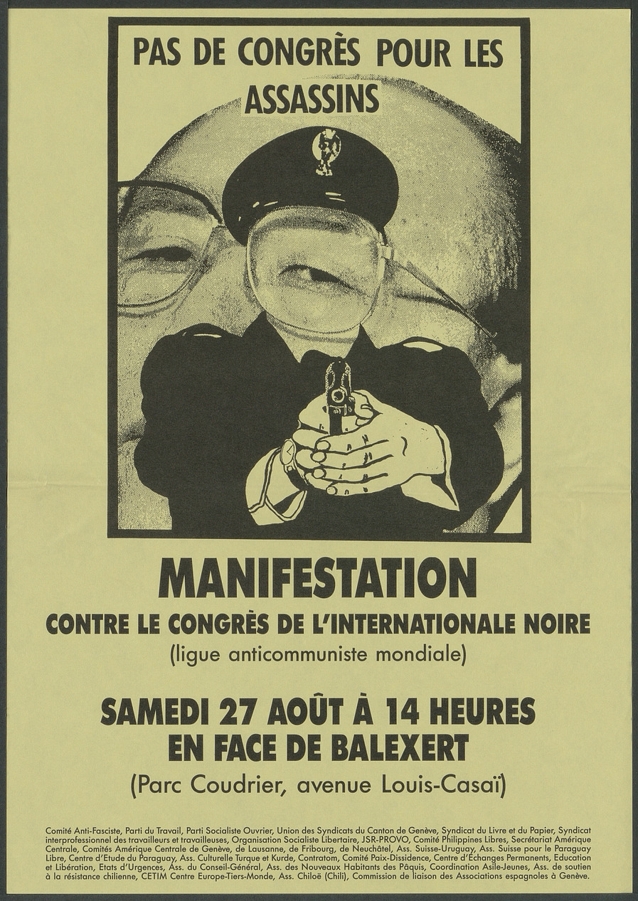 Affiche pour une manifestation « contre le congrès de l'Internationale noire (ligue anticommuniste mondiale) » à Genève. Dessin combinant un policier pointant une arme et un visage d'un homme portant des lunettes dans le fond.