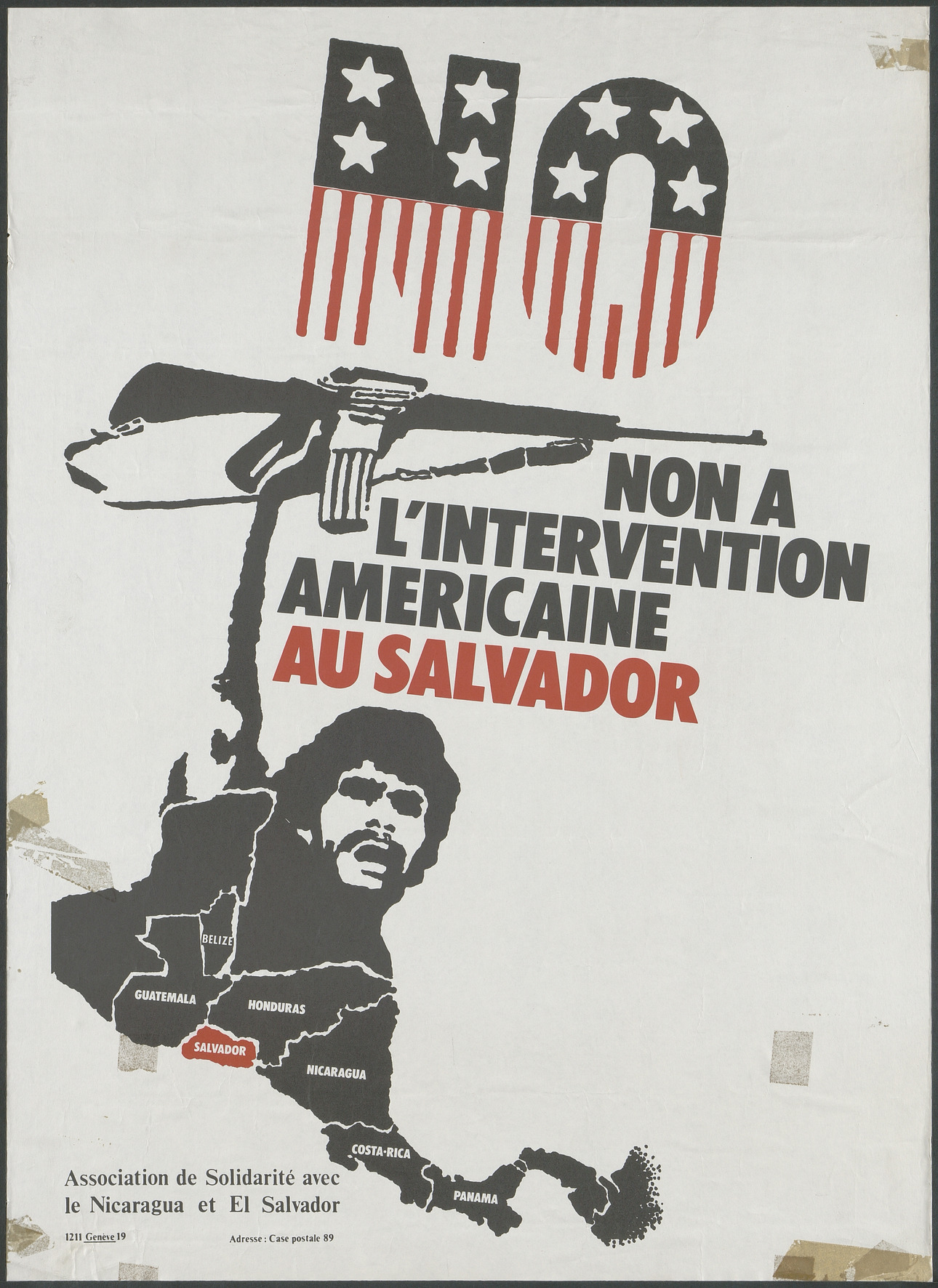 Affiche contre l'intervention américaine au Salvador. Dessin d'un homme brandissant une arme, son corps se fondant en une carte de l'Amérique centrale.