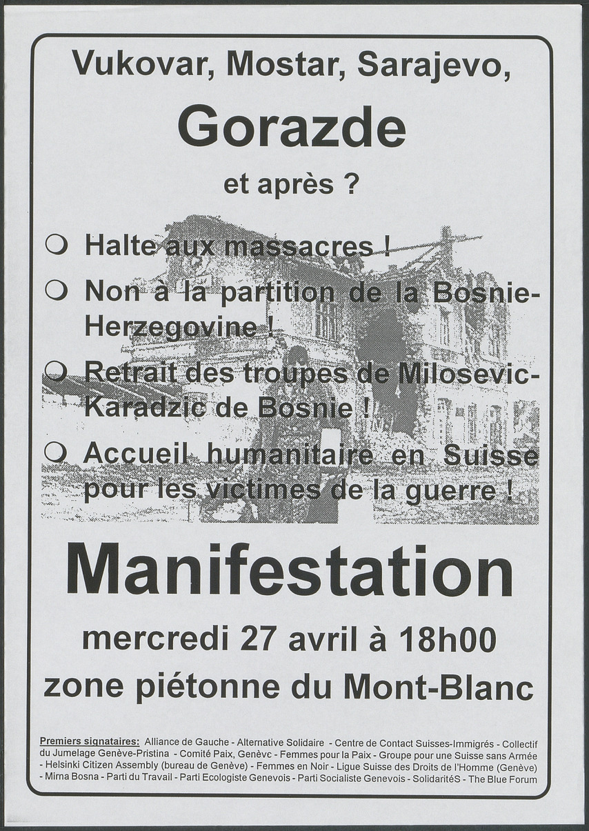 Affiche pour une manifestation à Genève contre les bombardements serbes en Bosnie-Herzégovine et pour un « accueil humanitaire en Suisse pour les victimes de la guerre ! »