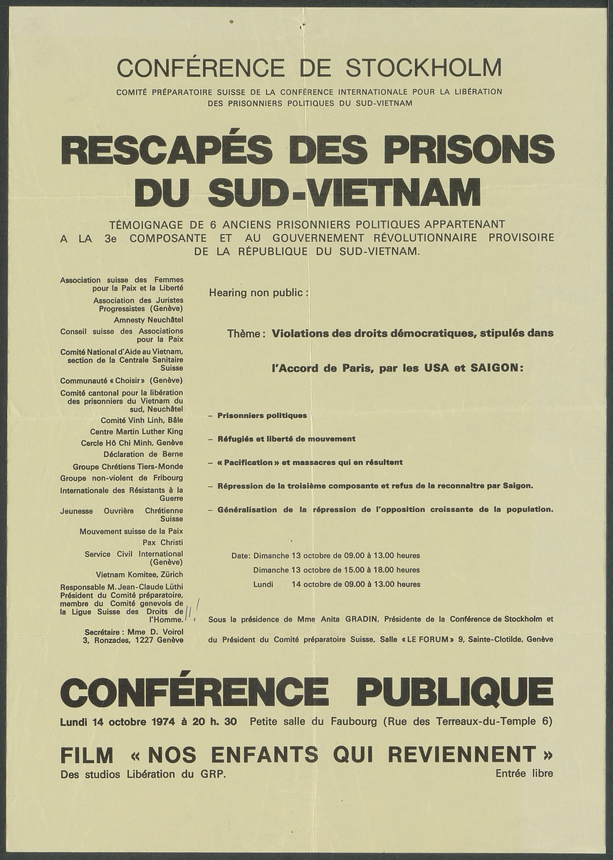 Affiche pour une conférence publique et la projection du film Nos enfants qui reviennent à la salle du Faubourg à Genève. Liste d'organismes co-organisateurs conséquente sur l'affiche.