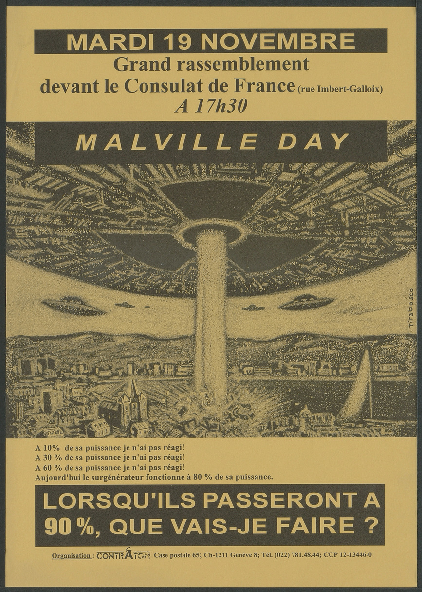 Affiche appelant à un rassemblement devant le Consulat de France à Genève, contre l'accélération du surgénérateur de la centrale de Creys-Malville. Dessin de la rade surplombée par une sorte de soucoupe volant, un large faisceau s'enfonce dans la ville en créant une explosion.
