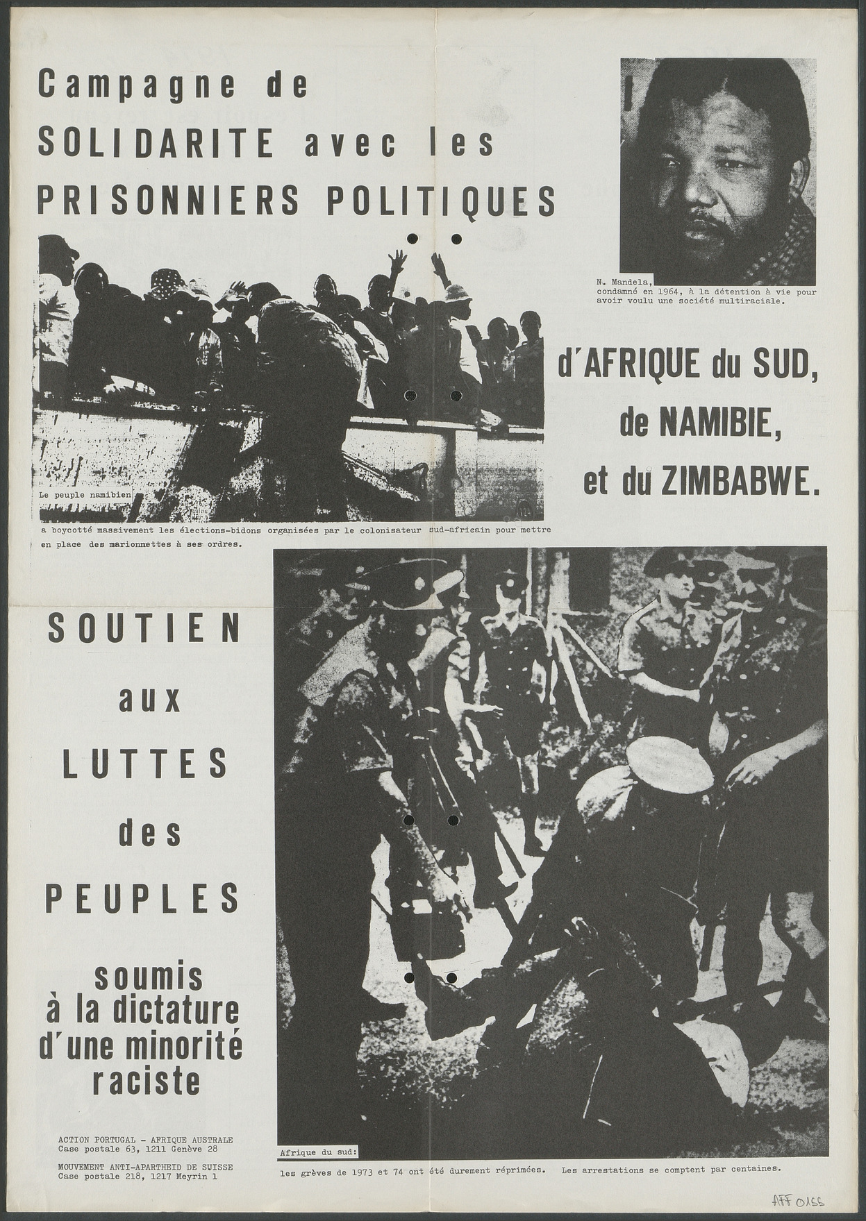 En 1974, l'APAA participe à une campagne pour la reconnaissance de l'indépendance de la Guinée-Bissau, puis en faveur des prisonniers politiques de Namibie, du Zimbabwé et d'Afrique du Sud en collaboration avec le Mouvement Anti-apartheid de Suisse. L'APAA participe également à la semaine nationale de solidarité avec le PAIGC, le MPLA et le FRELIMO.