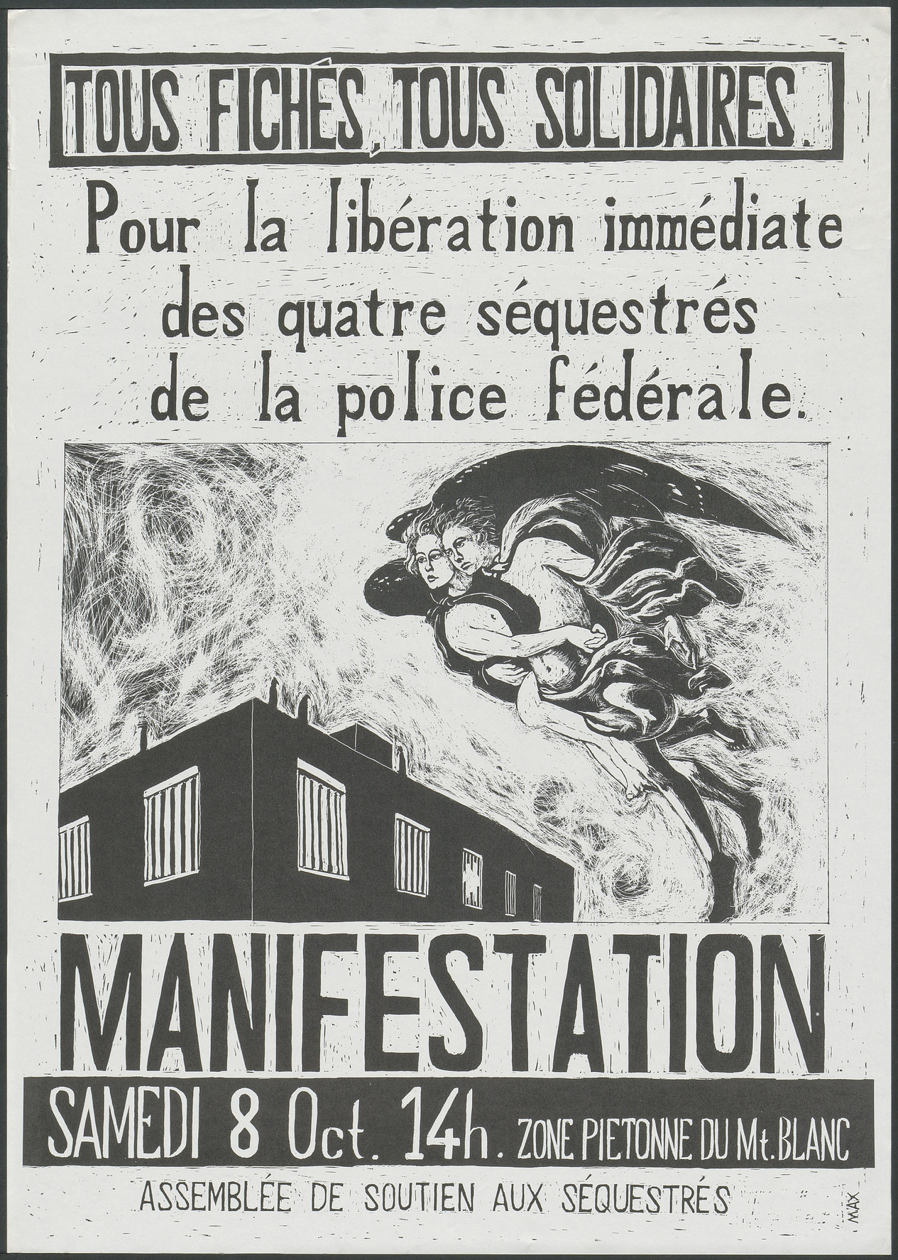 Affiche pour une manifestation de soutien à Genève, « pour la libération immédiate des quatre séquestrés de la police fédérale ». Dessin d'un ange libérant un prisonnier, une fenêtre de la prison dans le fond a les barreaux brisés.
